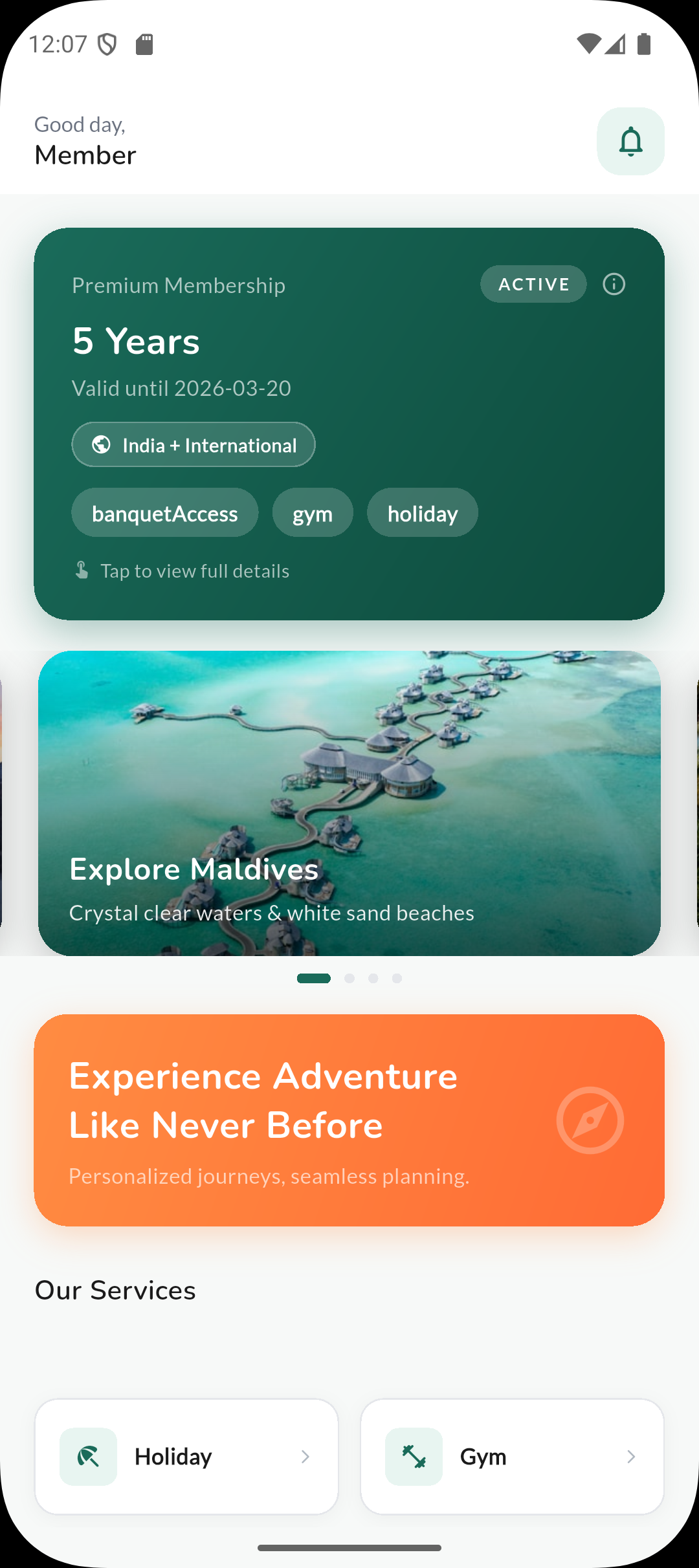 Premium travel & lifestyle membership app. Members manage holiday bookings, gym access, and Aadhaar uploads — all in one polished Flutter experience.